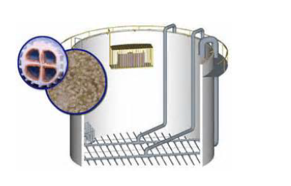 通过向反应器中投加一定数量的悬浮载体,提高反应器中的生物量及生物种类,从而提高反应器的处理效率。由于填料密度接近于水,所以在曝气的时候,与水呈完全混合状态,微生物生长的环境为气、液、固三相。载体在水中的碰撞和剪切作用,使空气气泡更加细小,增加了氧气的利用率。另外,每个载体内外均具有不同的生物种类,内部生长一些厌氧菌或兼氧菌,外部为好氧菌,这样每个载体都为一个微型反应器,使硝化反应和反硝化反应同时存在,从而提高了处理效果。